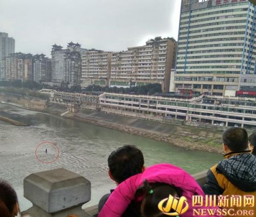 13時(shí)30分左右,沱江一橋上走過一名身著青色棉衣的小伙子,在沒人注意到的情況下,他翻上二號(hào)橋拱處的護(hù)欄。路過群眾大聲呼叫,正準(zhǔn)備去拉他時(shí),他縱身一躍跳了下去。群眾頓時(shí)緊張起來,心想小伙子兇多吉少。