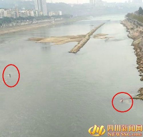 冬季的沱江處于枯水期,江水被中間的石塊分隔成兩條,中間石塊形成孤島。小伙子入水的地方是右邊水流湍急的一側(cè),只見他入水后不久,被沖了百米遠(yuǎn)外冒出了水面,竟奇跡般站在了水中央的淺水處。