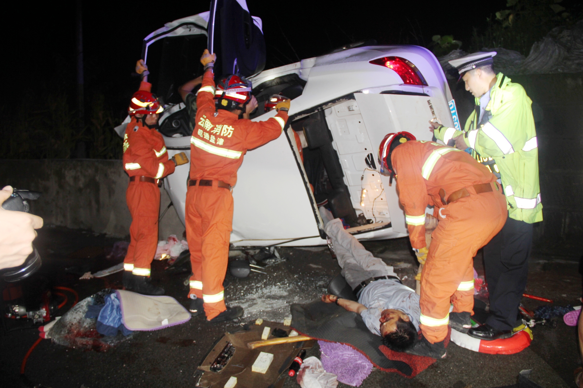 轎車側(cè)翻釀慘禍 鹽津消防雨夜?fàn)I救被困人員