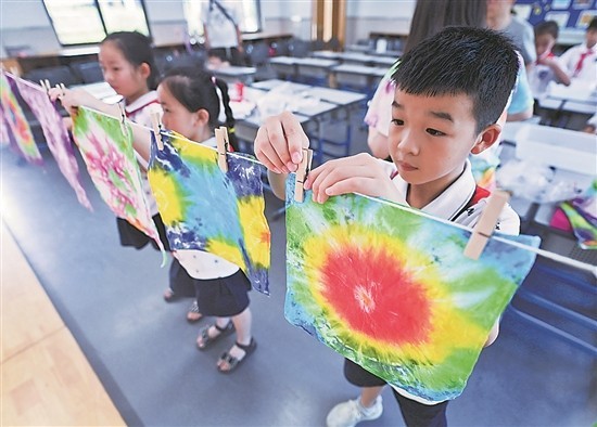 8月10日,湖州市吳興實(shí)驗(yàn)小學(xué)的學(xué)生把做好的扎染作品掛在教室里。位于浙江省湖州市的吳興實(shí)驗(yàn)小學(xué)開啟了以傳統(tǒng)鄉(xiāng)土文化為落腳點(diǎn)的“博學(xué)課堂”, ... [更多詳細(xì)]