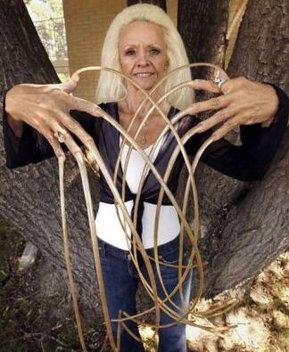 最長的手指甲。美國猶他州鹽湖城65歲老婦莉·里德蒙德從1979年起就拒絕剪掉自己漂亮的指甲,所以它們越長越長。2006年,她的每只指甲長度就超過了0.84米(33英寸),兩手指甲總長度達到8.53米(28英尺),里德蒙德也成了吉尼斯世界紀錄中擁有最長手指甲的人。