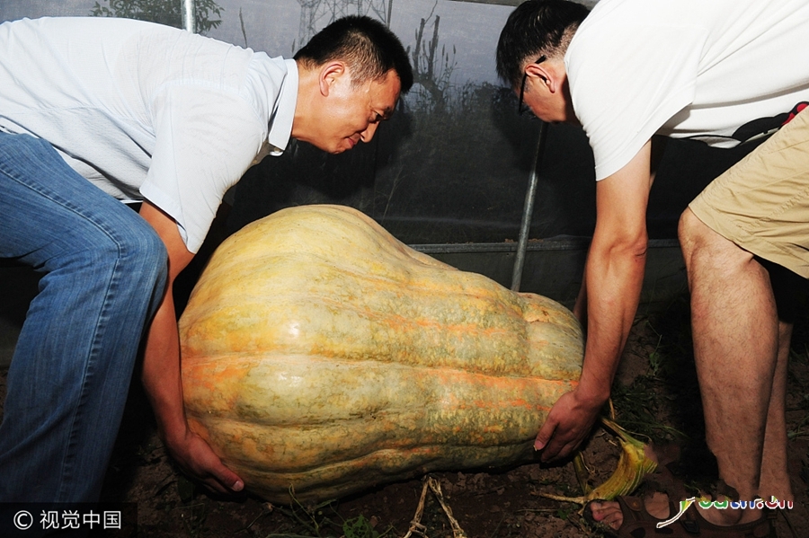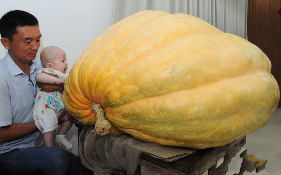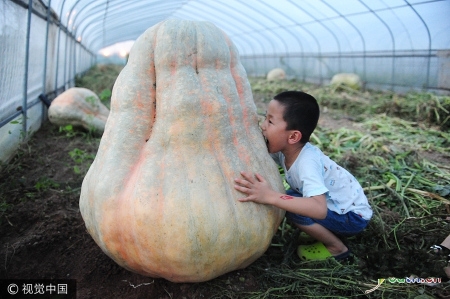 2017年8月20日,安徽省阜陽(yáng)市,一名小朋友和巨型南瓜來(lái)個(gè)零距離接觸。這些巨型大南瓜中最大的一個(gè)達(dá)560斤,直徑為115公分,吸引許多市民前來(lái)觀看稀奇。