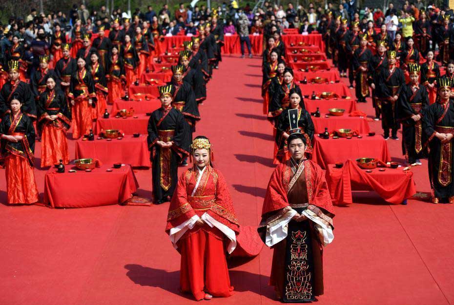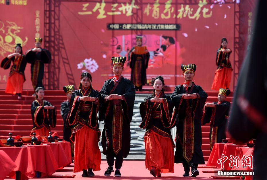 3月26日,漢服集體婚禮儀式中。當日,36對青年新人在安徽省合肥市三國遺址公園舉行漢式集體婚禮,新人們在贊禮官的帶領下,進行祈愿禮、拜謝禮、正席禮等漢式禮儀,再現(xiàn)中華傳統(tǒng)婚典文化的古韻之美。