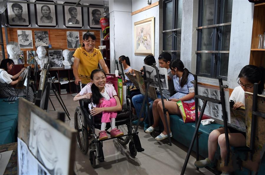 7月25日,盛悅在媽媽的陪伴下來(lái)到畫(huà)室學(xué)習(xí)。安徽省舒城縣杭埠鎮(zhèn)杭南村的盛悅3歲時(shí)不幸患神經(jīng)母細(xì)胞瘤,盡管她的父母傾盡全力,四處求醫(yī),最終盛悅還是因胸腔脊椎變形而高位截癱。2016年,堅(jiān)持讀到初一的盛悅終因病痛難支,不得不退學(xué)回到家中。幸運(yùn)的是,在家中盛悅逐漸對(duì)繪畫(huà)產(chǎn)生了興趣。今年3月,舒城縣一家畫(huà)室的鄭泉老師為盛悅的堅(jiān)強(qiáng)與才藝所打動(dòng),免費(fèi)讓她學(xué)習(xí)繪畫(huà)。幾個(gè)月過(guò)去了,盛悅的繪畫(huà)水平得到快速提高,老師和愛(ài)心志愿者正積極為她籌辦作品展。盛悅在日記中寫(xiě)道:“我羨慕一切美好的事物,雖然殘疾讓我無(wú)法做到想要的自己,但只要有筆、有紙,我就要用我的畫(huà),去表達(dá)那些美好的情感。繪畫(huà)給了我夢(mèng)的翅膀,我成為一只自由的鳥(niǎo)、一條快樂(lè)的魚(yú),甚至是天上一朵白云……”