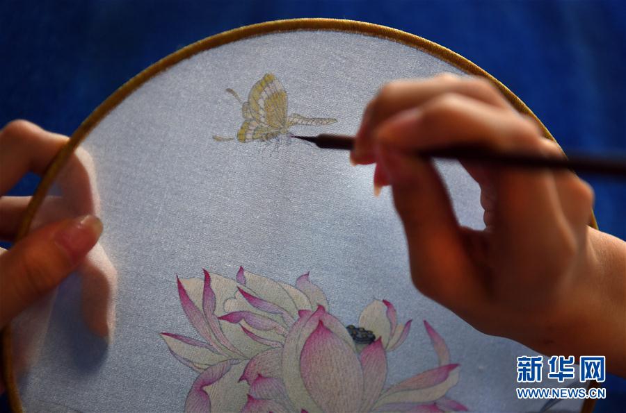 盛悅在精心創(chuàng)作工筆扇畫(huà)(7月25日攝)。新華社記者 陶明 攝