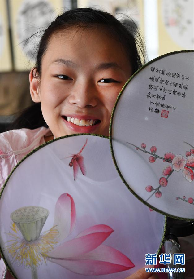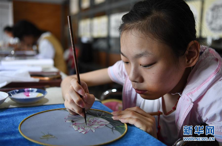 7月25日,盛悅在畫(huà)室學(xué)習(xí)班創(chuàng)作工筆扇畫(huà)。新華社記者 陶明 攝