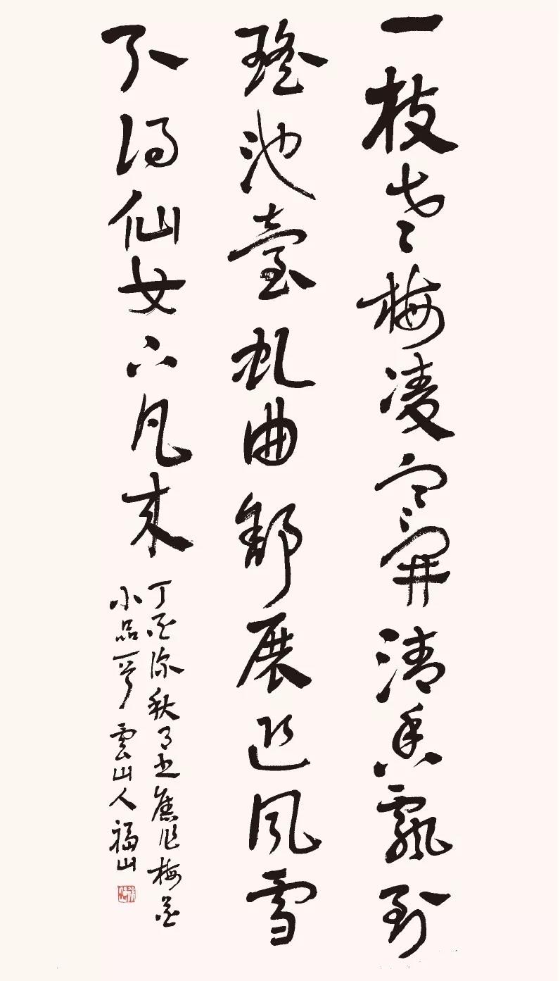 《題梅花小品》 一枝老梅凌寒開,清香飄到瑤池臺(tái)。虬曲舒展迎風(fēng)雪,引得仙女下凡來。尺寸:69cm×138cm 材質(zhì):紙本水墨 年代:2017