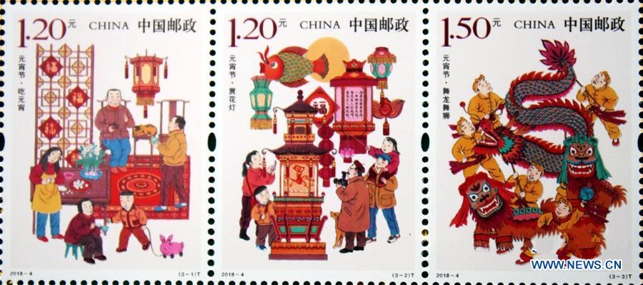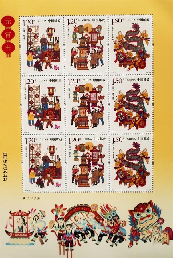 這是3月2日在河北遵化拍攝的《元宵節(jié)》特種郵票。當(dāng)日,中國郵政發(fā)行《元宵節(jié)》特種郵票1套3枚,這是我國第一次發(fā)行元宵節(jié)郵票。該套郵票圖案內(nèi)容分別為“吃元宵”、“賞花燈”和“舞龍舞獅”,全套郵票面值為3.90元。