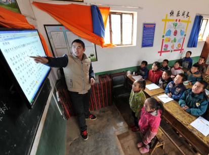 寧夏西海固地區(qū)涇源縣涇河源鎮(zhèn)底溝村教學點的老師利用多媒體教學設備給學生們上課。(新華社記者 彭昭之 2015年3月19日攝)