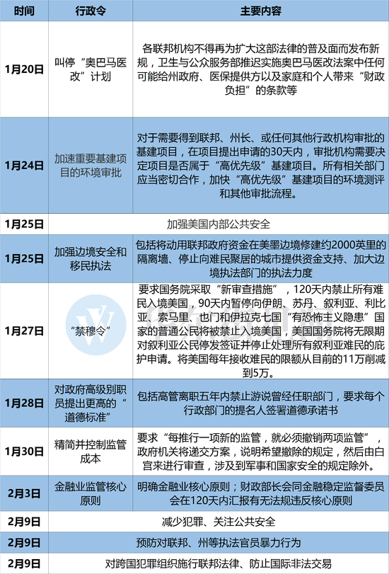 下圖為特朗普上任以來簽署的行政令一覽,由華爾街見聞?wù)怼?/p>