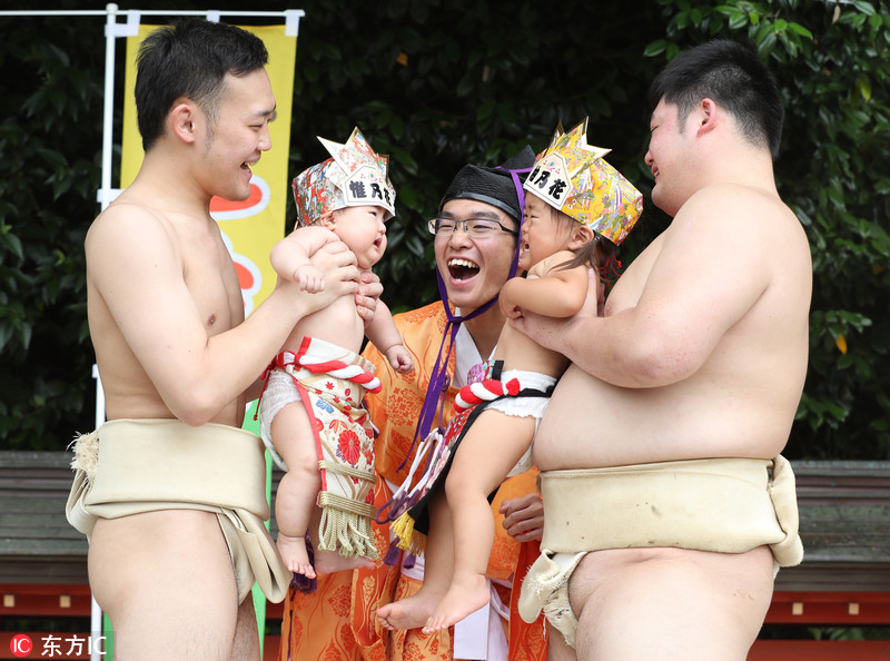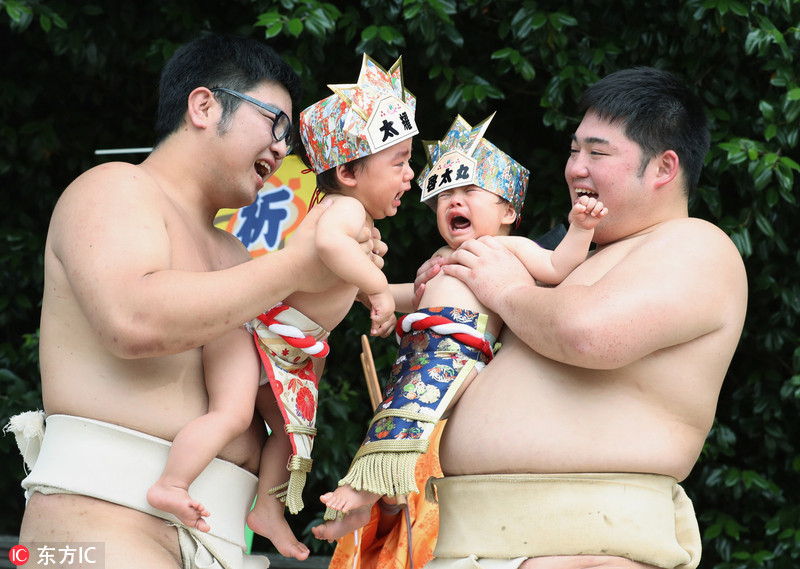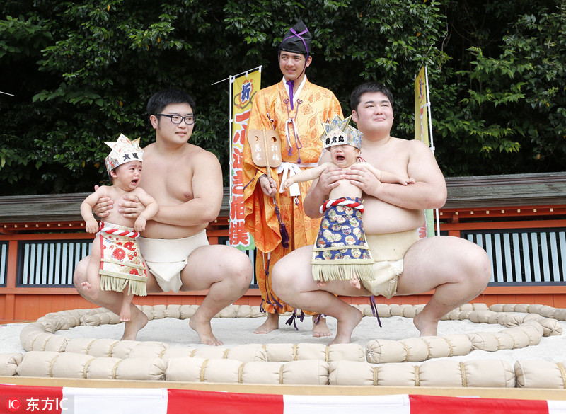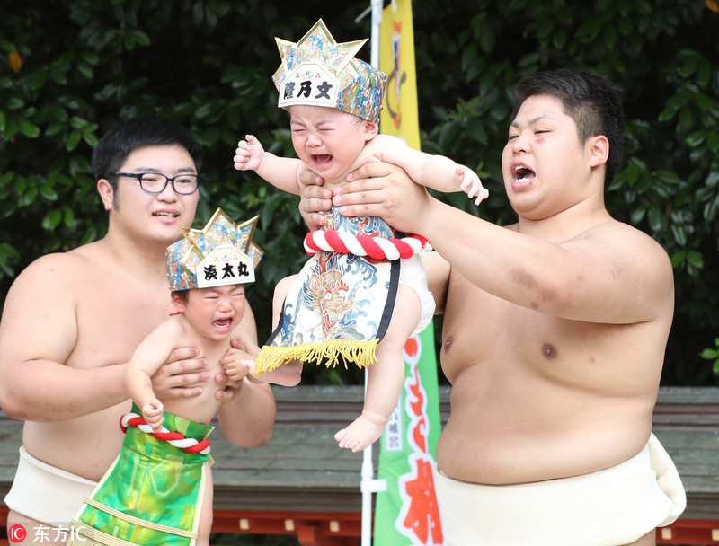 當(dāng)?shù)貢r(shí)間2017年7月17日,日本橫濱,相撲選手抱著寶寶參加“嬰兒啼哭大賽”,祈禱健康成長,寶寶哭得聲音越大并且最快哭的那個(gè)將成為比賽的勝出者。Ayaka Kawano/東方IC