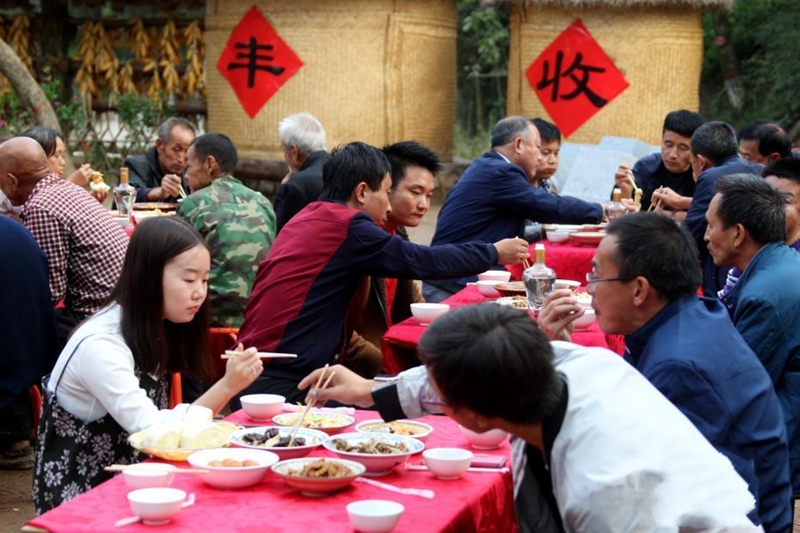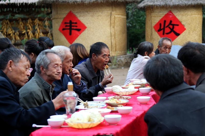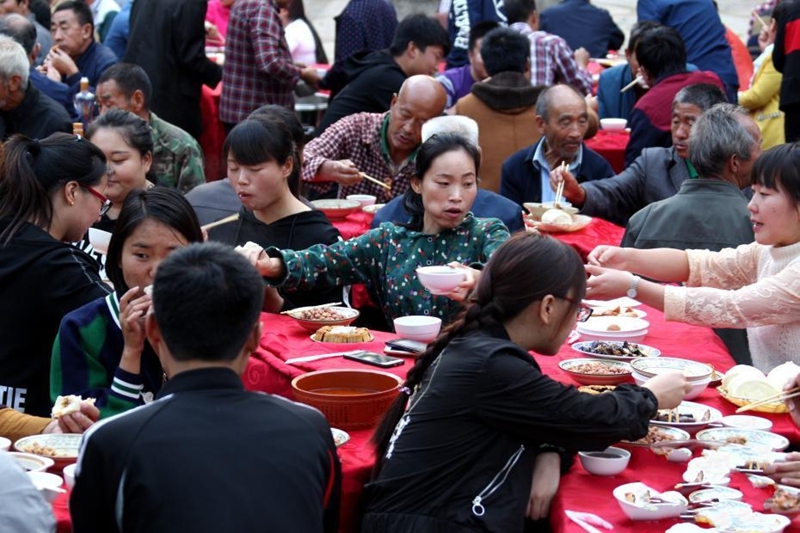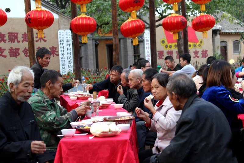 9月29日傍晚,國慶前夕,河南省盧氏縣新坪村張燈結(jié)彩,百余村民們圍坐于村委會門前的百草園廣場,他們拿出自家的拿手好菜,手工牛肉丸、熬炒柴雞、山水老豆腐、粉蒸紅薯葉、清炒香菇、清蒸南瓜等幾十樣的特色美食。聚在一起吃“百家宴”,話家長里短,擺放著美食的桌子圍成了巨大的“國慶”字樣,場面十分壯觀。