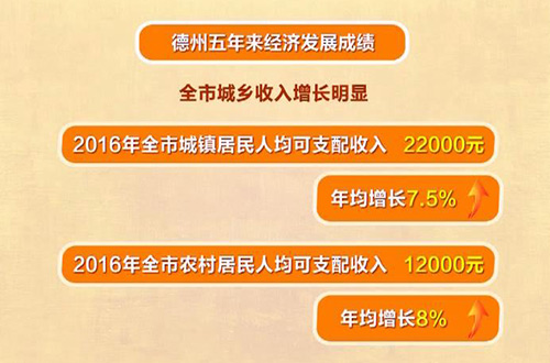 有這樣幾組數(shù)據(jù),印證著德州五年來經(jīng)濟發(fā)展的成績:2016年,德州的地區(qū)生產(chǎn)總值2945億元,五年來年平均增長9.9%。固定資產(chǎn)投資2529億元,年均增長17%;公共財政預算收入183.5億元,是2011年的1.9倍。區(qū)域經(jīng)濟更加活躍,德州經(jīng)濟技術(shù)開發(fā)區(qū)和高新技術(shù)產(chǎn)業(yè)開發(fā)區(qū)成功晉升國家級。經(jīng)濟穩(wěn)步發(fā)展,百姓的生活自然跟著越來越好,這五年,城鄉(xiāng)結(jié)構(gòu)發(fā)生了歷史性變化,全市常住人口城鎮(zhèn)化率達到53.5%,比2011年提高11.1%。全市城鄉(xiāng)收入增長明顯。2016年,全市城鄉(xiāng)居民人均可支配收入分別達到22000元和12000元,年均增長7.5%和8%。
