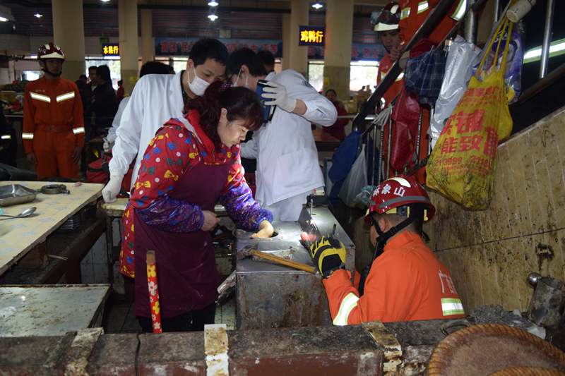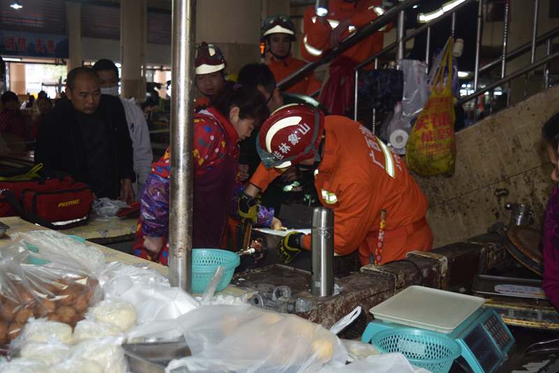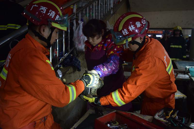 3月29日12時41分,象山中隊接到指揮中心調(diào)度稱:桂林市象山區(qū)西門菜市內(nèi)一女子在清洗絞肉機時不慎左手被絞肉機夾住無法取出。接警后,象山中隊立即出動1個搶險編隊、2輛消防車、14名官兵趕赴現(xiàn)場處置。