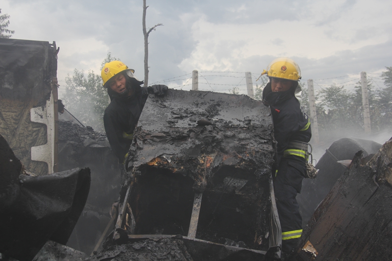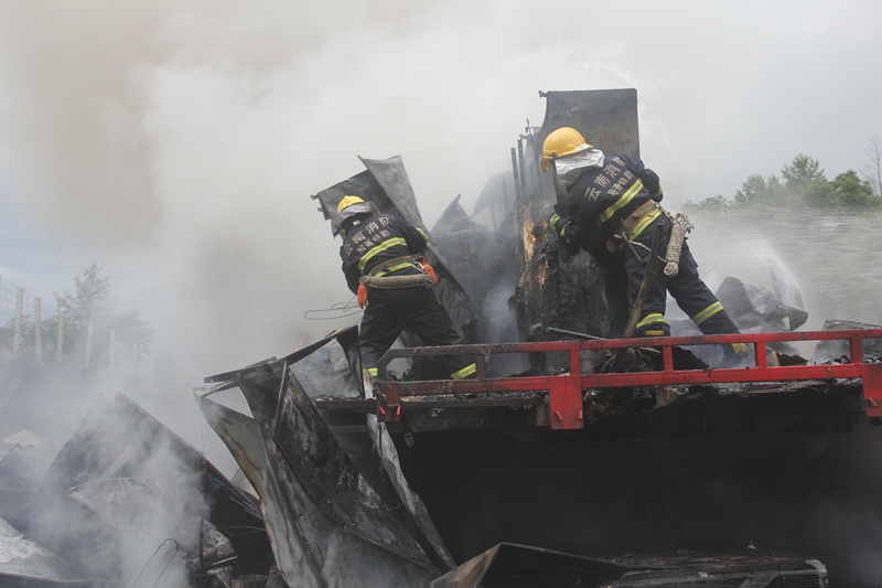 16時(shí)56分,救援官兵到達(dá)現(xiàn)場。此時(shí),先期到達(dá)的交警已經(jīng)對交通進(jìn)行了管制,指揮員經(jīng)過初步偵察,發(fā)現(xiàn)貨車上的火勢正處于猛烈燃燒階段,火苗飛舞,濃煙滾滾,熾熱的火焰使得塑料隔離帶已經(jīng)開始塌陷變形,通紅的車體上不時(shí)發(fā)出一震刺耳的爆裂聲。大火正在向救援人員示威,烏黑的濃煙仿佛要吞噬一切。如不及時(shí)對火勢進(jìn)行壓制,后果將不堪設(shè)想。指揮員當(dāng)機(jī)立斷下達(dá)了作戰(zhàn)命令:安全員立即協(xié)助到場交警擴(kuò)大警戒范圍;救援一組鋪設(shè)一條水帶干線出兩支水槍對火勢進(jìn)行壓制,一支占領(lǐng)高速路旁的坡地,居高臨下,對大火發(fā)起猛烈攻擊。另一支水槍控制火勢,阻止其蔓延。兩支水槍左右夾擊,奈何堆放整齊的冰箱宛如給火焰穿上了一層鎧甲,局面陷入了僵持。據(jù)此,副中隊(duì)長沈龍立即令救援二組在水槍的掩護(hù)下對燃燒貨物進(jìn)行清理。“快了...快了...”那一張張汗水蒸干后顯得通紅的臉龐上透著一股堅(jiān)毅。