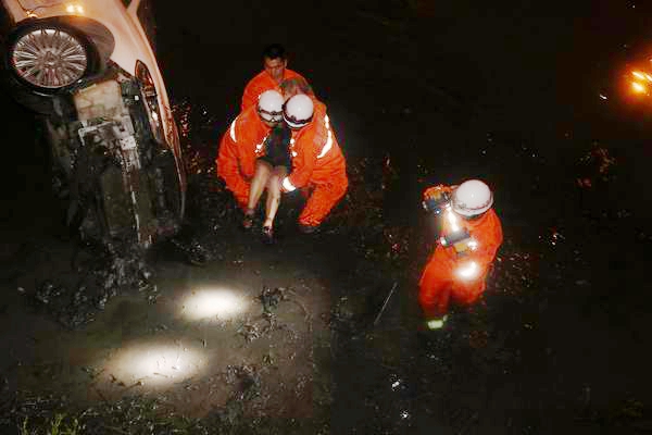 7月30日凌晨1時(shí)42分,云南省昭通魯?shù)榇箨?duì)值班室接到報(bào)警電話稱,昭魯快捷通道魯?shù)榭h柳樹閘帆船花園往魯?shù)榭h城新區(qū)方向30米處發(fā)生一起交通事故,一輛轎車墜入4米左右深的河道中,有4人被困,1人被現(xiàn)場群眾救出,還有3人被困車內(nèi),請消防隊(duì)救援。接到報(bào)警后,大隊(duì)立即出動2車11人冒雨趕赴現(xiàn)場處置。