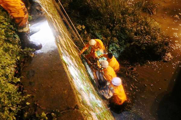 1時(shí)48分,救援官兵趕到現(xiàn)場,經(jīng)偵詢得知,事故車輛墜入到了路邊4米左右深的河道中,河水深約1米,有4人被困車內(nèi),其中1人已被現(xiàn)場群眾救出,還有3人被困車內(nèi)。根據(jù)現(xiàn)場情況,指揮員立即派出4名官兵佩戴救援繩,攜帶撬棍和多功能救援擔(dān)架下到河床,對事故現(xiàn)場和被困人員情況進(jìn)行現(xiàn)場偵察,其余戰(zhàn)士全力協(xié)助緩緩下到河底,只見在河底一輛白色轎車沖進(jìn)了河道里,車身因受猛烈撞擊嚴(yán)重變形,車門因車身變形無法打開。了解情況后,偵察組戰(zhàn)士與路面的指揮員進(jìn)行了匯報(bào),指揮員決定再讓一名戰(zhàn)士帶上繩子下到河床,一起對被困人員進(jìn)行救援。不一會兒,另一名戰(zhàn)士按要求帶著繩子下到了河底。按照作戰(zhàn)方案,救援官兵立即用撬棍對車門進(jìn)行強(qiáng)行破拆,爭分奪秒投入到搶救被困人員的各項(xiàng)工作中。營救被困人員的過程中,救援官兵的手指被劃破,河床泥沙、渾濁的河水、天空下著的雨水和汗水無數(shù)次浸透了救援官兵的衣褲,像抹了膠水一般緊貼在官兵的身上,萬分難受,但這并沒有擋住他們營救被困者的步伐,他們這時(shí)只有一個(gè)念頭,那就是竭盡全力營救被困人員。經(jīng)過近30多分鐘的緊張救援,破損的車門終于被打開,被困在車內(nèi)的3人成功救出。此時(shí)救援官兵的衣褲和帽子不知被汗水和雨水浸透了多少遍,但他們并沒有注意到自己衣帽上的濕了又干,干了又濕的層層汗跡,而是積極為如何將被困人員順利抬上河岸出主意,想辦法。河道河墻與河床成垂直狀,只有借助搶險(xiǎn)救援繩才能把被困人員順利抬上河岸。于是河岸上的救援官兵立即拿來了繩索,下放到了河底,河底救援的官兵將擔(dān)架的兩端系到繩上后,河岸邊的官兵同現(xiàn)場交警一道一起用力拉拽繩索,小心翼翼地將被困人員拉上了河岸。