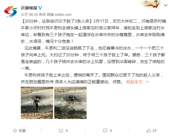 2月17日,農(nóng)歷大年初二,山東沂南縣蘇村鎮(zhèn)牛家小河村村民牛恩利去湖頭鎮(zhèn)上房家溝村岳父家拜年,誰知走到上房家溝村水庫邊,卻看到有三個孩子抱在一起漂浮在水庫中央的冰窟窿里,水庫去年剛剛清淤,水很深,情況十分危急。見此情景,牛恩利二話沒說就跳了下去。